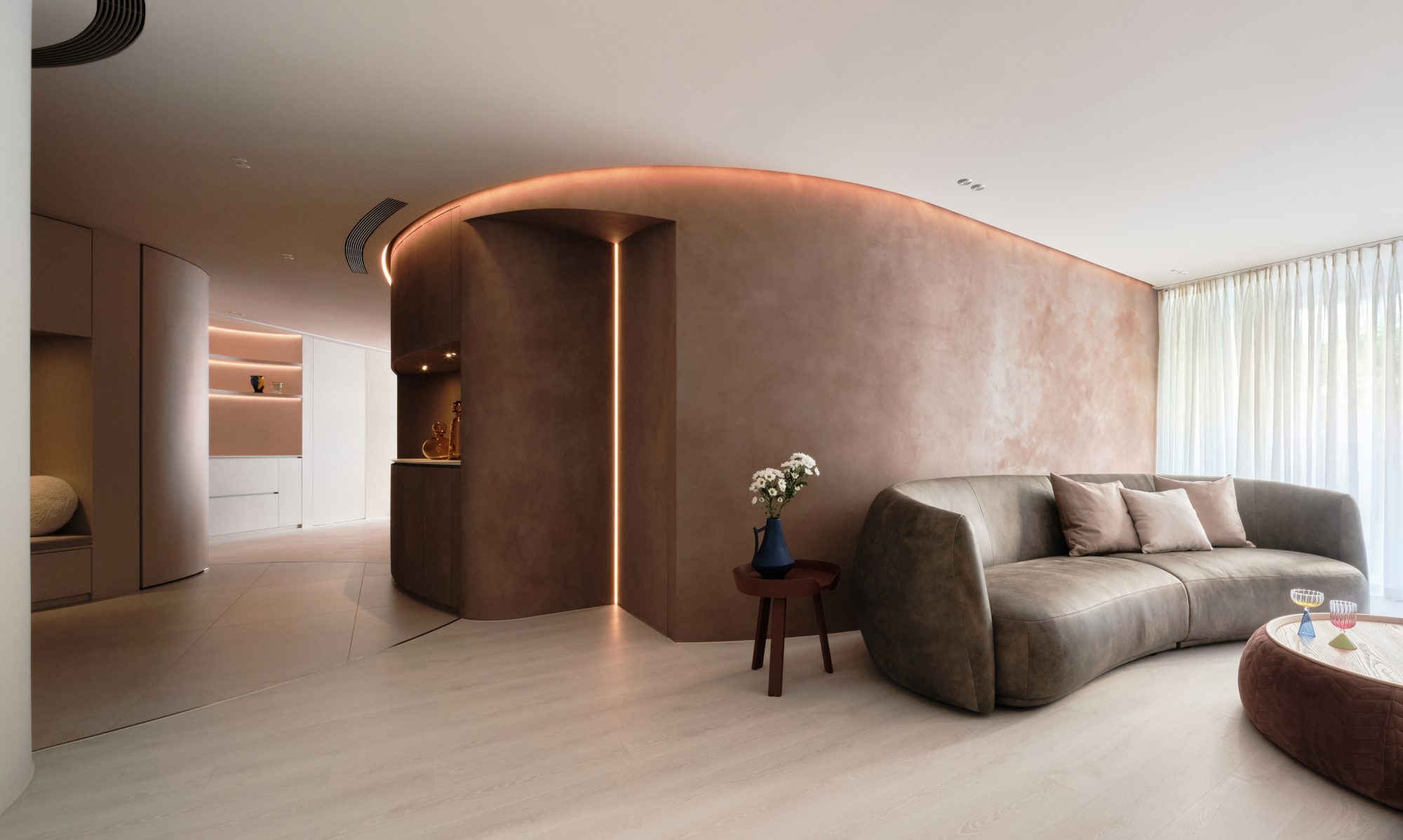 如此,以各種材質的不同特性、及質感搭配,讓空間雖在一種顏色系列為主的空間中,也能擁有豐富的層次變化。